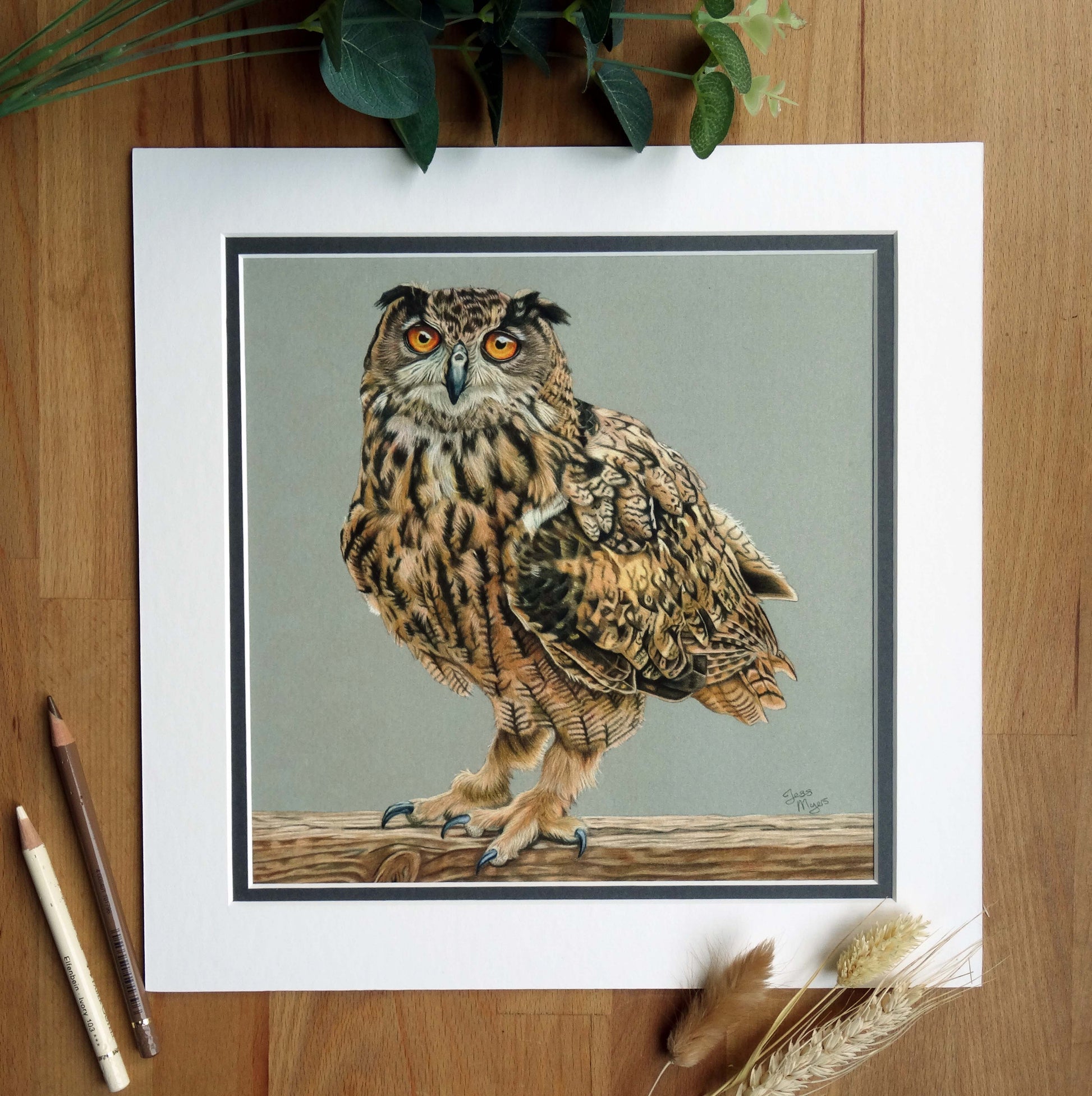 This Eurasian Eagle Owl drawing has been faithfully reproduced as a premium giclée fine art print, taken from my original pencil artwork. Printed on archival paper with museum-quality inks, the piece captures the owl’s piercing eyes, intricate feather textures, and commanding presence — showcasing one of Europe’s most impressive birds of prey.