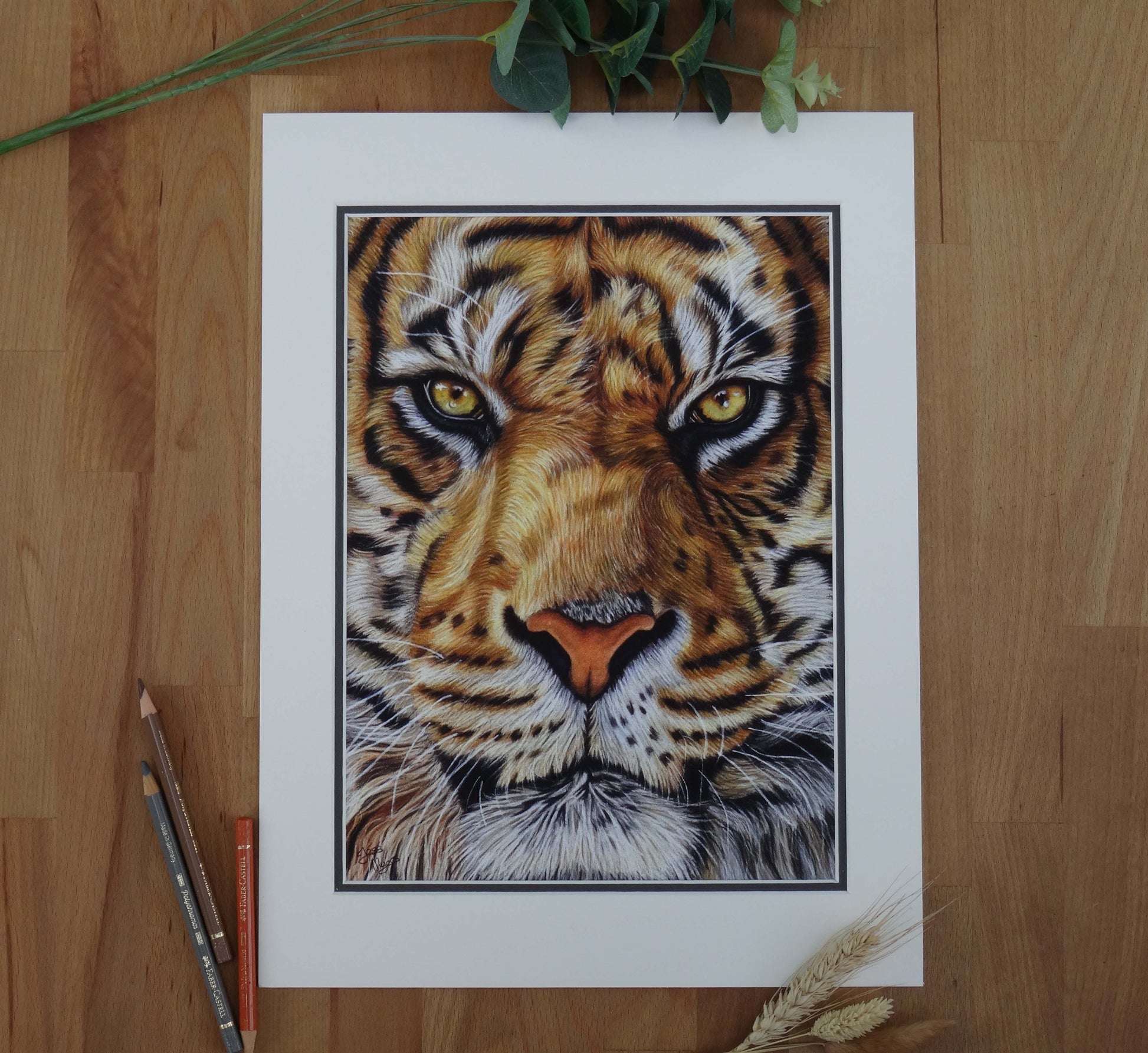 “Tiger Portrait” is a striking coloured pencil drawing of a tiger, reproduced as a premium giclée fine art print. Printed on archival paper with museum-quality inks, this artwork captures the tiger’s piercing gaze, powerful features, and intricate fur detail — celebrating the majesty of one of the world’s most iconic big cats.