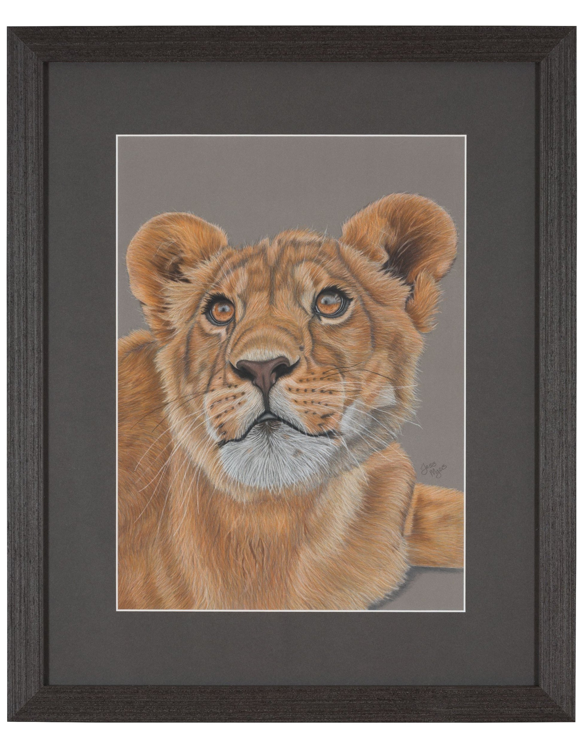 This drawing captures the King of the Jungle in his adolescence. What drew me to this particular image were those rather striking eyes. This drawing was created using Faber Castell Polychromos on Pastelmat paper. The artwork is ready to hang, supplied with both mount and frame as shown in the photograph. Overall sizing is approximately 45cm wide x 55cm high.