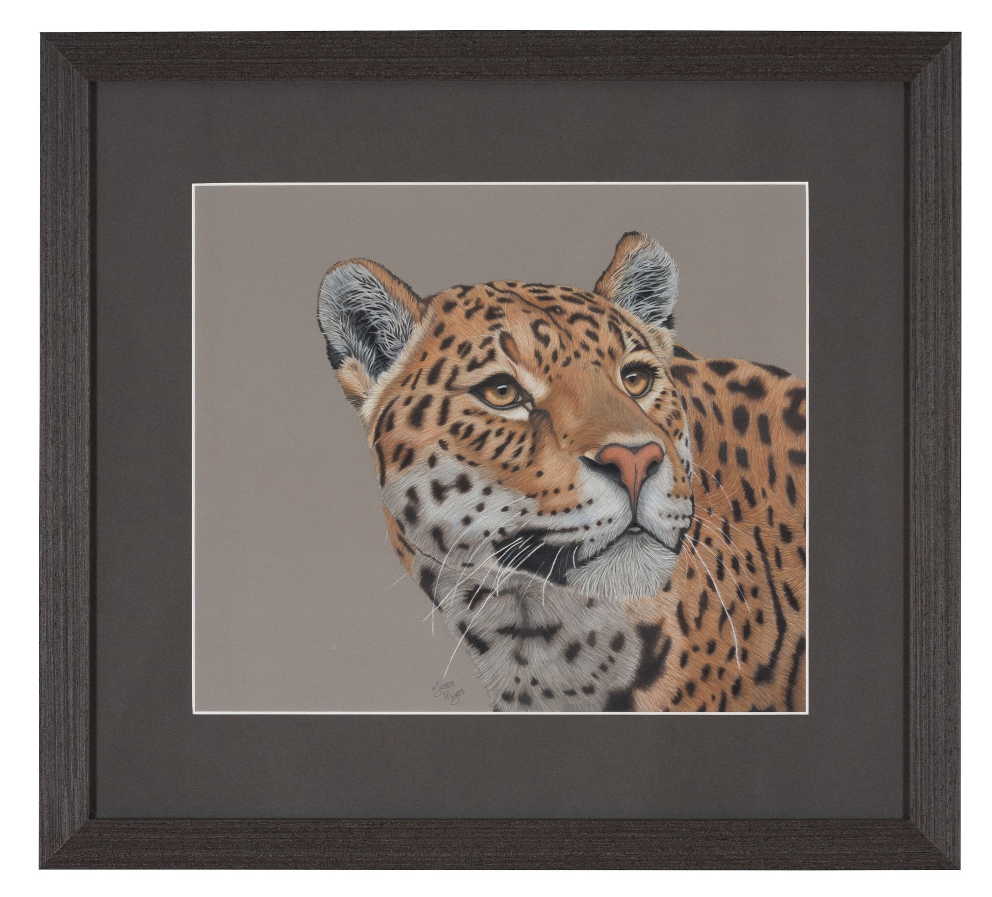 The title of this piece alone will give away what drew me to this amazing image. Those amber eyes of steel belong to the world's third largest big cat. The indigenous meaning behind their name means "He who kills with one leap" which reflects their incredible hunting skills and strength. This drawing was created using Faber Castell Polychromos on Pastelmat paper. The artwork is ready to hang, supplied with both mount and frame as shown in the photograph. Overall sizing is approximately 52.5cm wide x 48cm high.