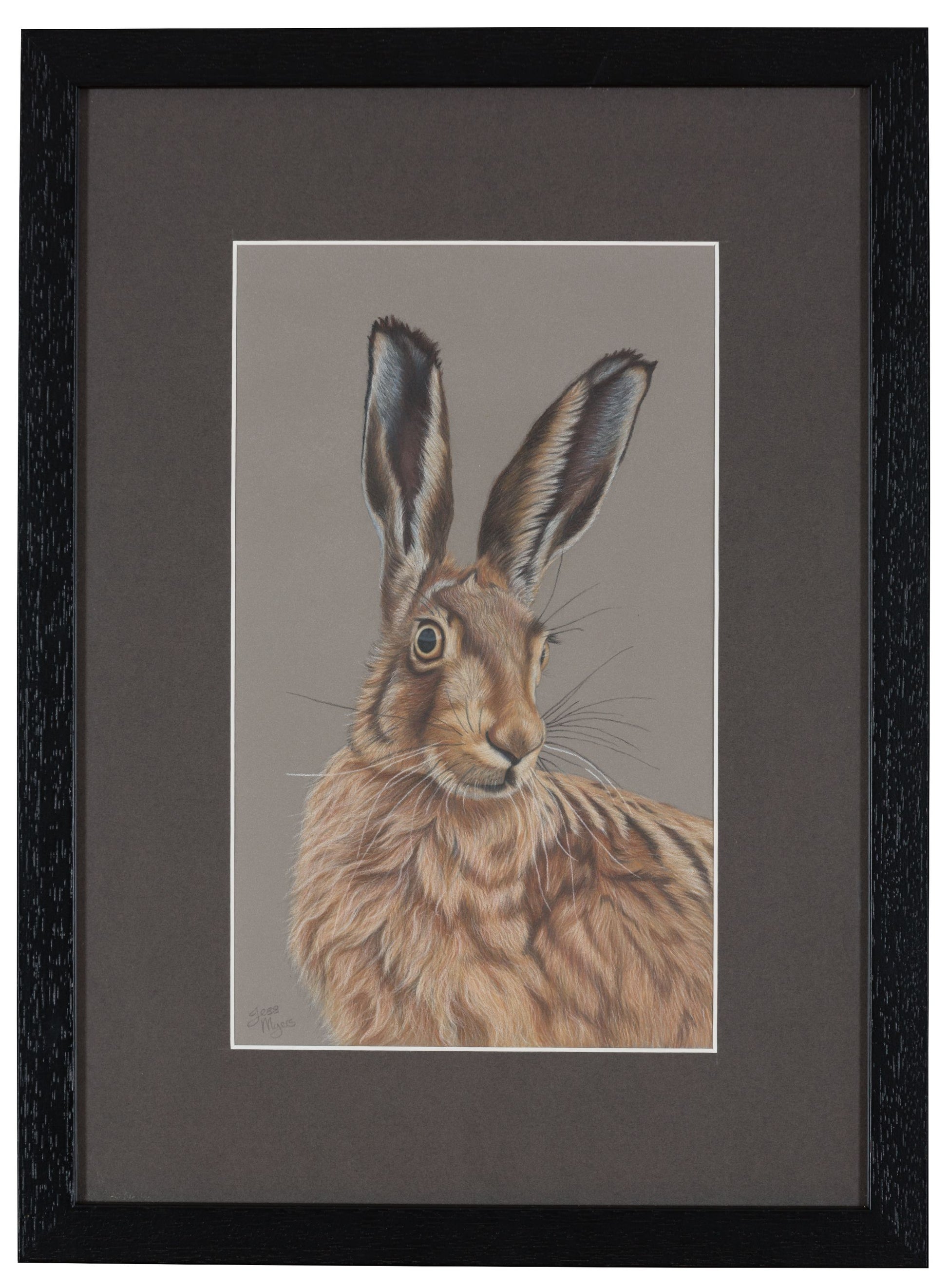 "Caught in Headlights" captures a fluffy Hare, an animal which can often be spotted dashing through Britain's countryside. This drawing was created using Faber Castell Polychromos on Pastelmat paper. The artwork is ready to hang, supplied with both mount and frame as shown in the photograph. Overall sizing is approximately 34cm wide x 46cm high.