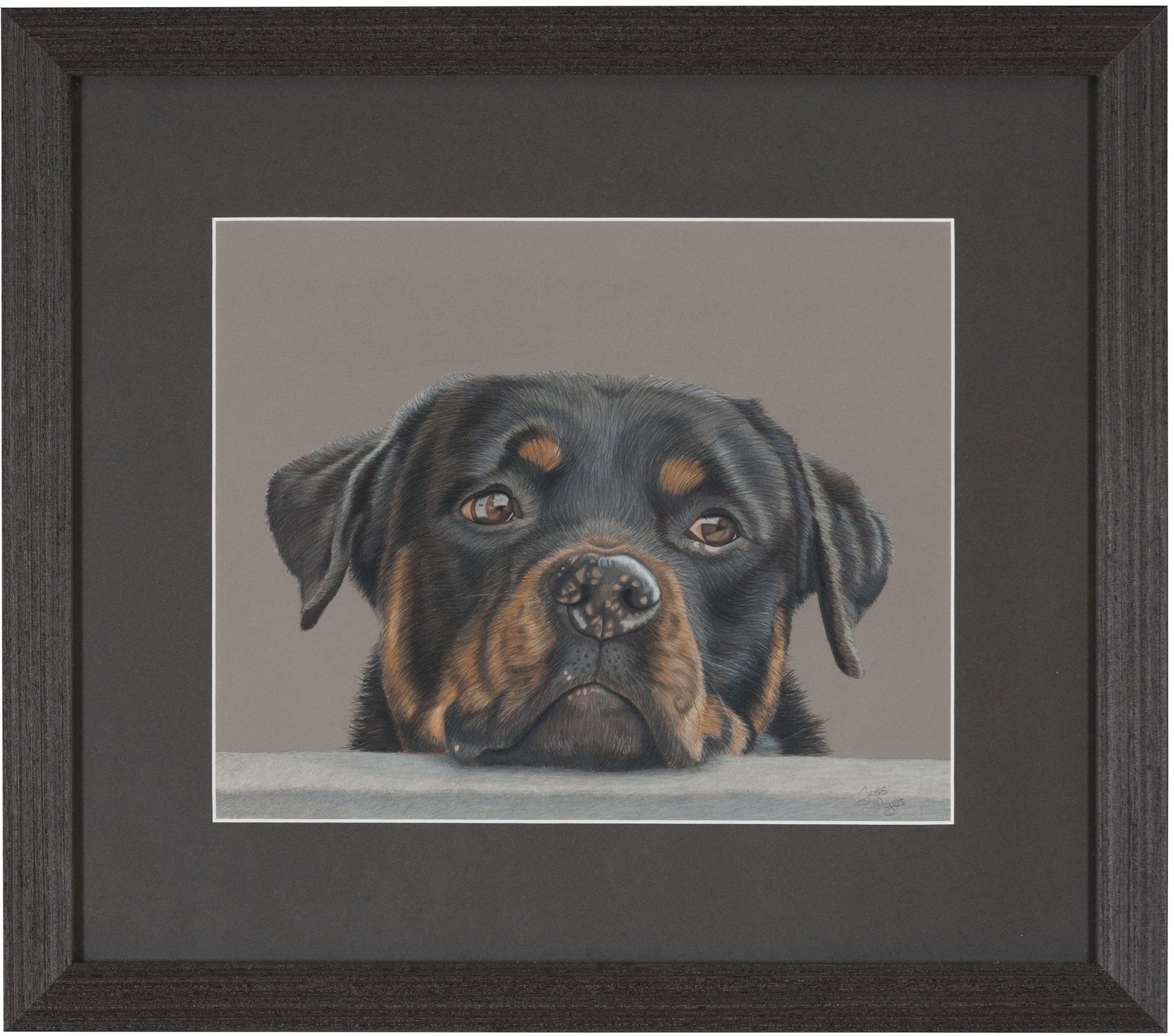 Like all dogs this cheeky canine can turn on the big puppy dog eyes. With a face like that, who could possible resist? This drawing was created using Faber Castell Polychromos on Pastelmat. The artwork is supplied ready to hang, with mount and frame, as shown in the photo. Overall sizing is approximately 48cm wide x 42.5cm high.