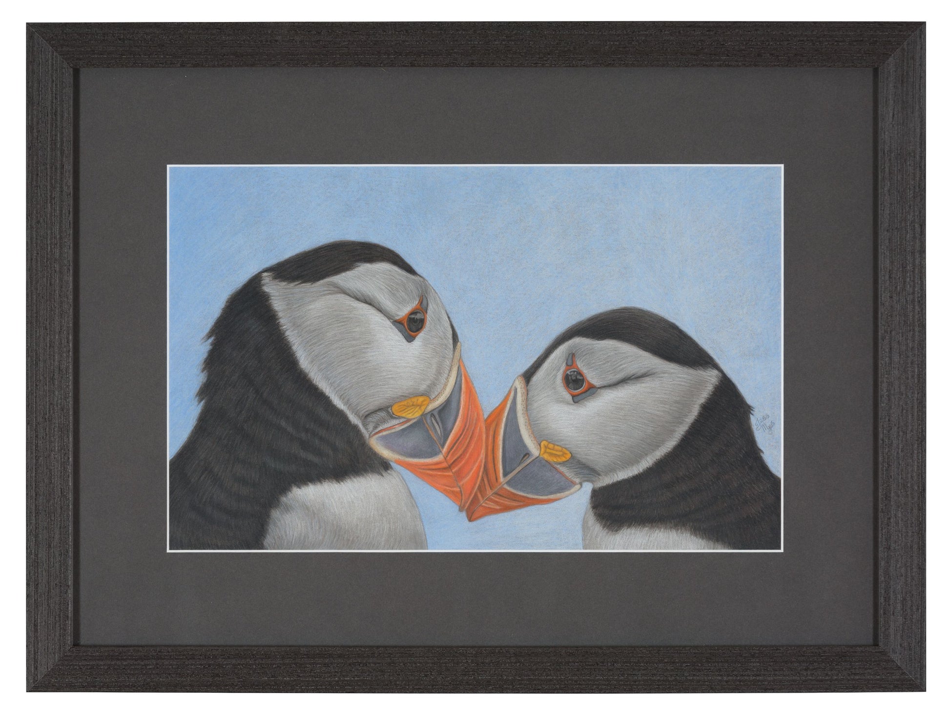 This drawing captures a sweet moment between two loved up Atlantic Puffins. They migrate to our coastlines in the spring ready to breed, where after a winter at sea, they will reunite with their lifelong mate. This drawing was created using Faber Castell Polychromos on Pastelmat paper. The artwork is ready to hang, supplied with both mount and frame as shown in the photograph. Overall sizing is approximately 56cm wide x 42cm high.