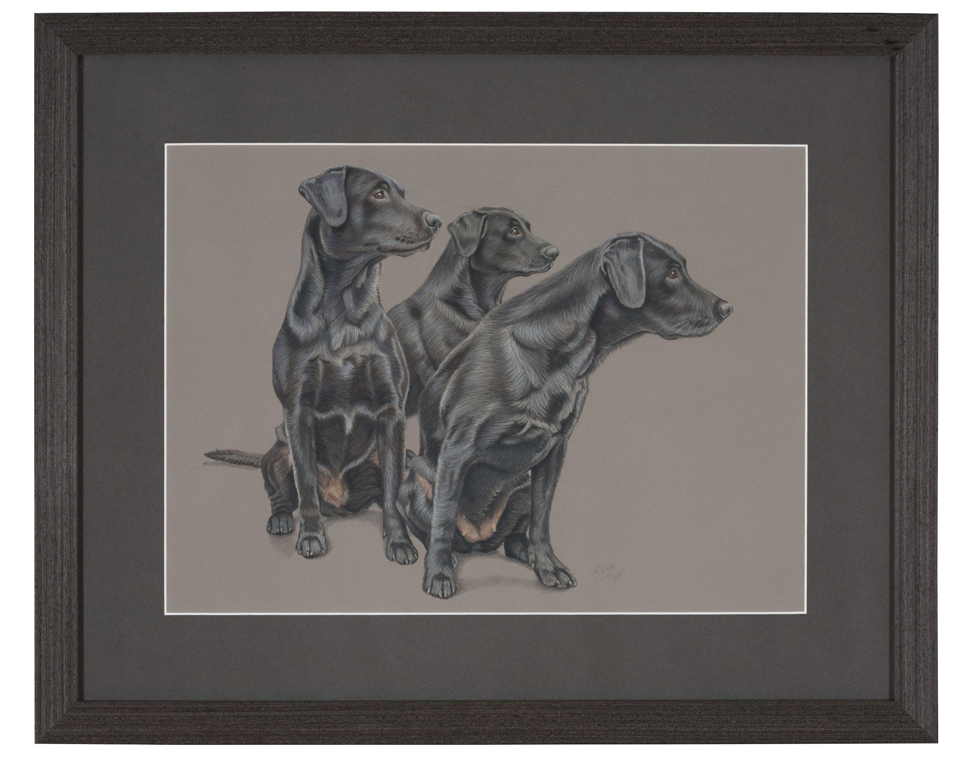 "The Shooting Party" captures three Labradors captivated by something in the distance, poised and ready to pounce at a moments notice. This drawing was created using Faber Castell Polychromos on Pastelmat paper. The artwork is ready to hang, supplied with both mount and frame as shown in the photograph. Overall sizing is approximately 60.5cm wide x 49cm high.