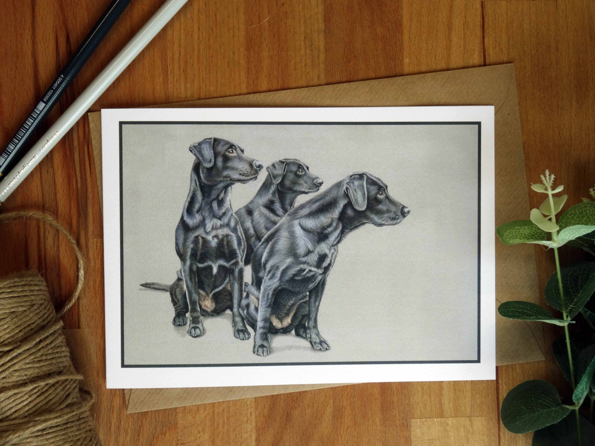 This Labrador greetings card features my original pencil drawing “Shooting Party”, capturing the intelligence, loyalty, and charm of three working Labradors. Professionally printed on premium-quality card stock, the artwork highlights the dogs’ attentive expressions and fine detail, making it a perfect choice for dog lovers and country sports enthusiasts.