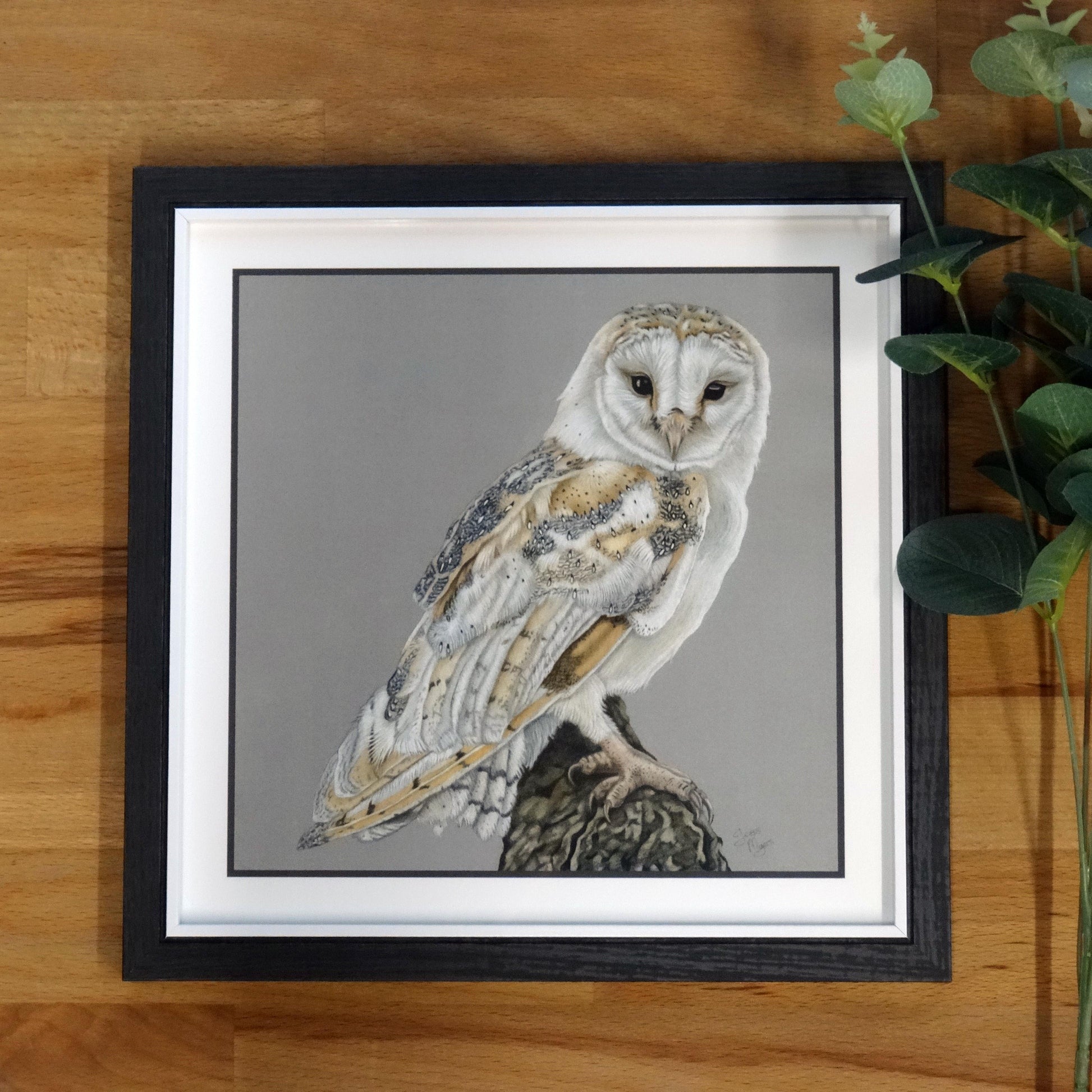This small framed giclée print features my original pencil drawing of a barn owl, one of Britain’s most iconic and mysterious nocturnal birds. Professionally reproduced on archival fine art paper with museum-quality inks, the artwork captures the barn owl’s piercing eyes, soft feather detail, and graceful presence.