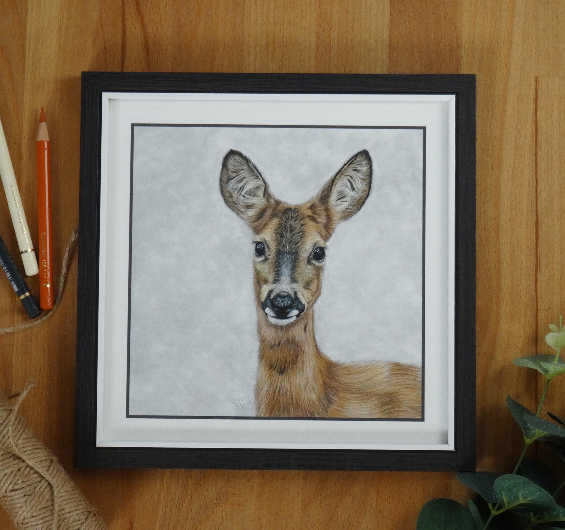 This small framed giclée print features my original pencil drawing of a roe deer, one of the most graceful and iconic animals of the British countryside. Professionally reproduced on archival fine art paper with museum-quality inks, the artwork captures the roe deer’s alert gaze, fine fur detail, and quiet elegance.